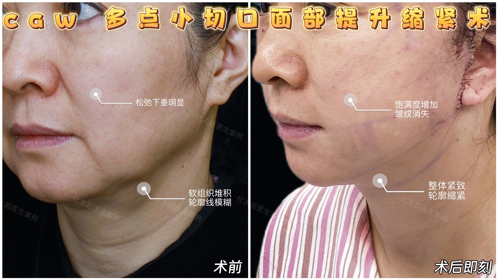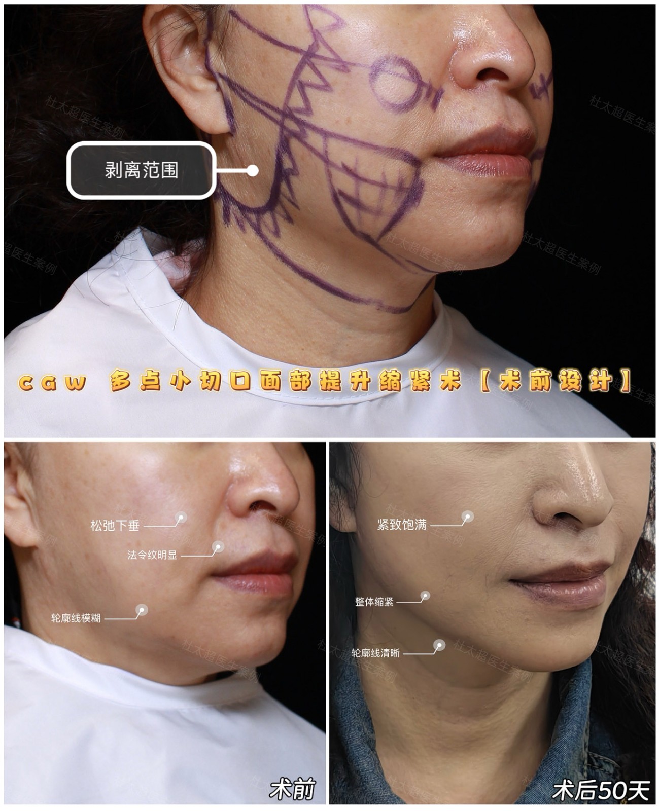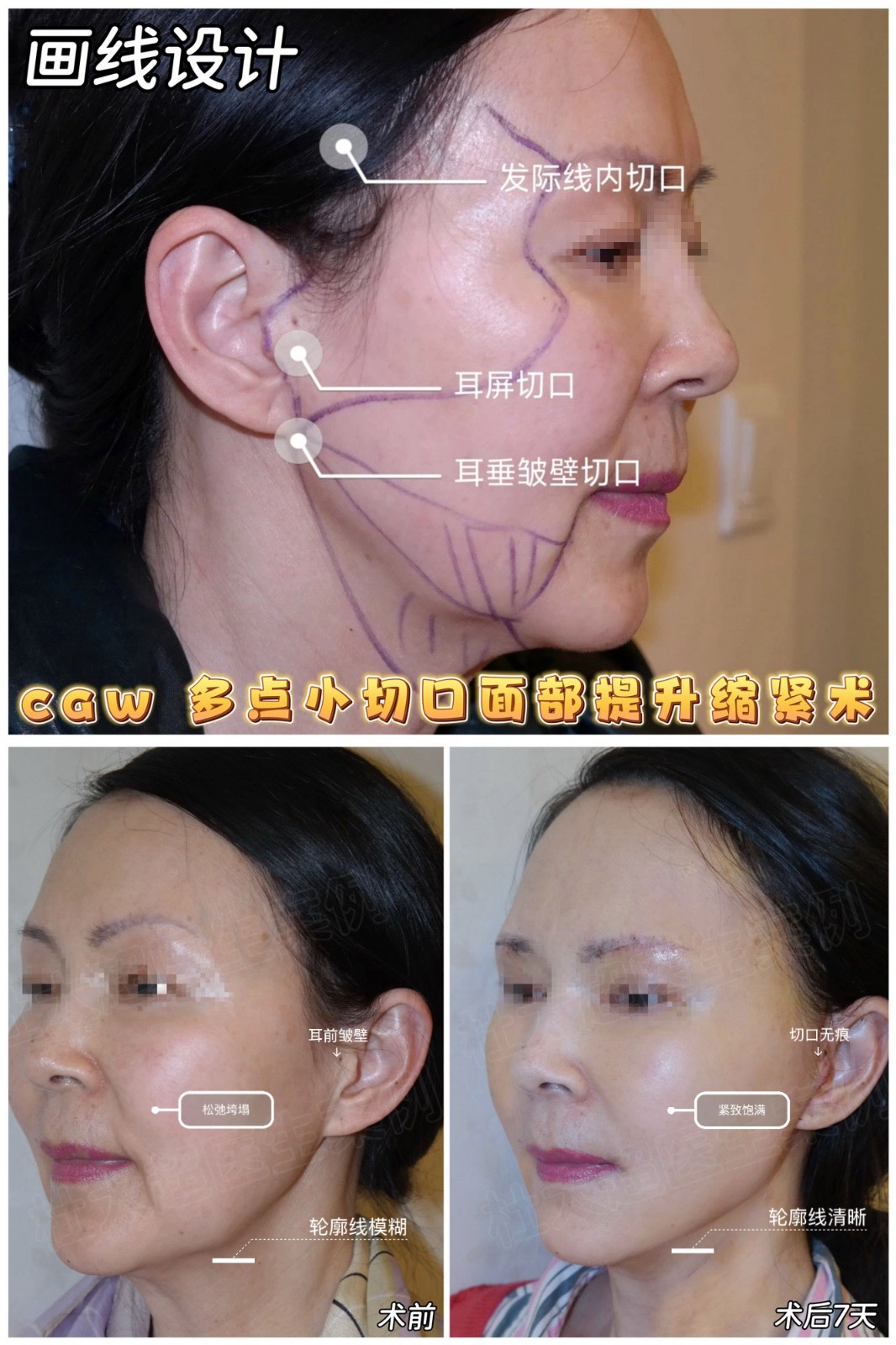 caw多点小切口面部提升缩紧术,以精准充分的剥离,实现术后50天面部整体提升、紧致缩紧,痕迹不明显,呈现自然年轻态。