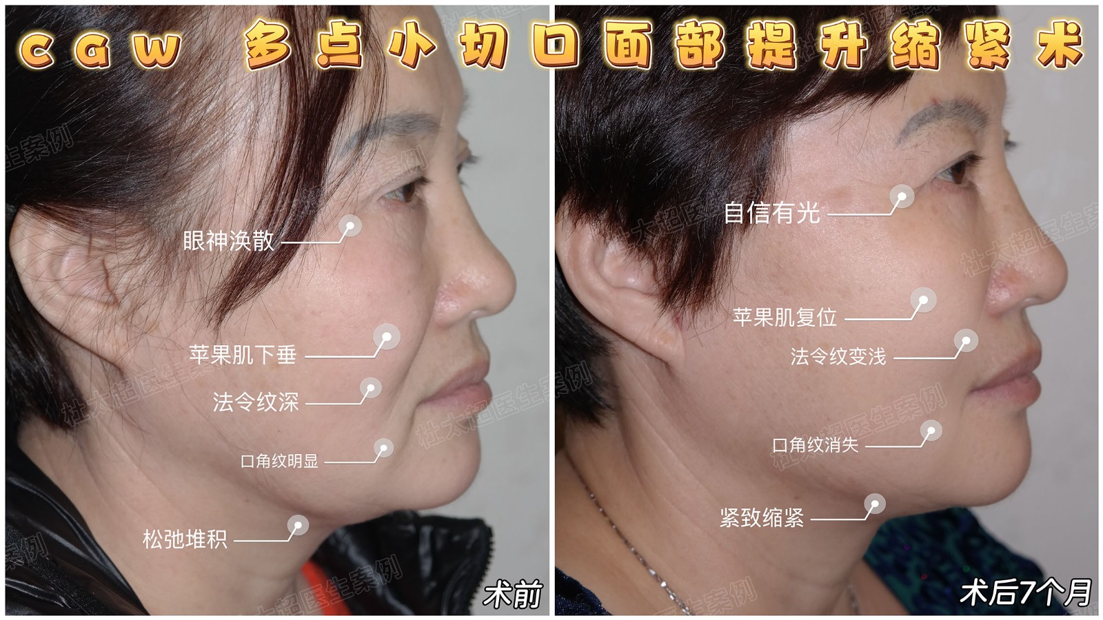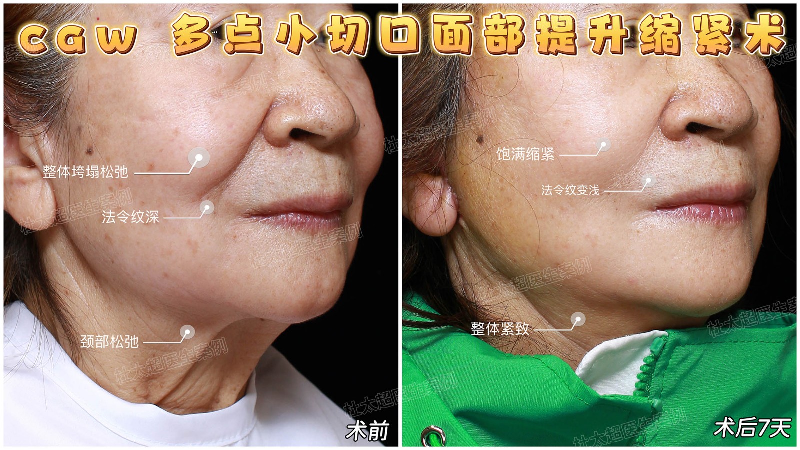 caw多点小切口面部提升缩紧术后即刻、术后7天效果显著:术前,求美者面容尽显疲态,凹陷、松弛等衰老问题明显,影响面部美观...