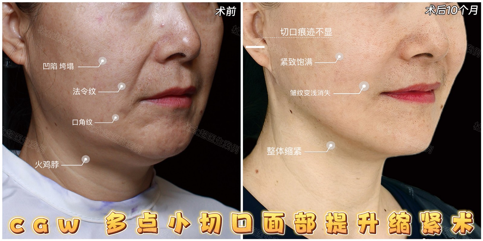 caw多点小切口面部提升缩紧术效果展现:持久性:术前术后对比,有效改善面部松弛、下颌缘模糊,术后2年9个月仍保持良好效果,...