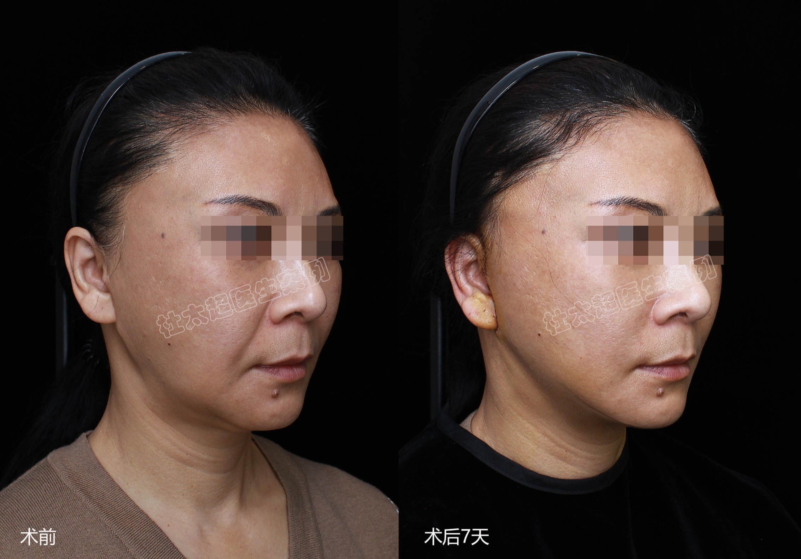 33岁求美者苹果肌下垂,法令纹加深,通过拉皮手术改善面部下垂状态,帮她设计隐蔽式切口提升(颞部发际线内切口),术后没有...