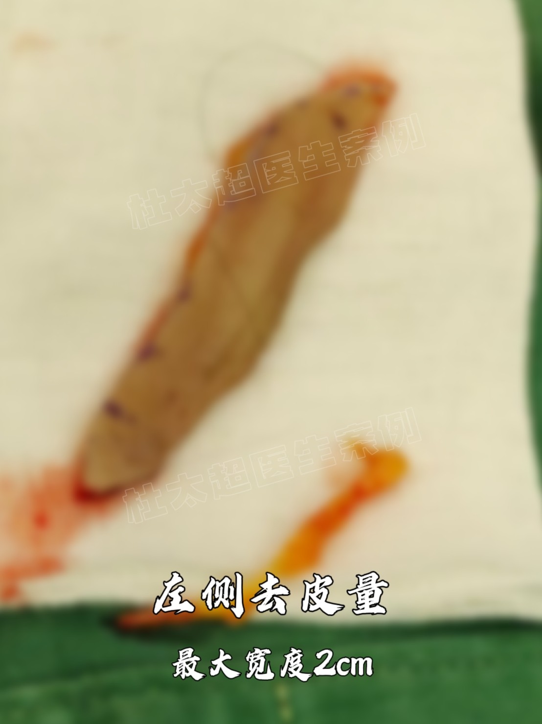 54岁求美者去皮量展示,这位求美者面部松弛程度明显,图为提升后耳前皮肤余量切除,左侧去皮量最大宽度2cm,右侧去皮量最大宽...