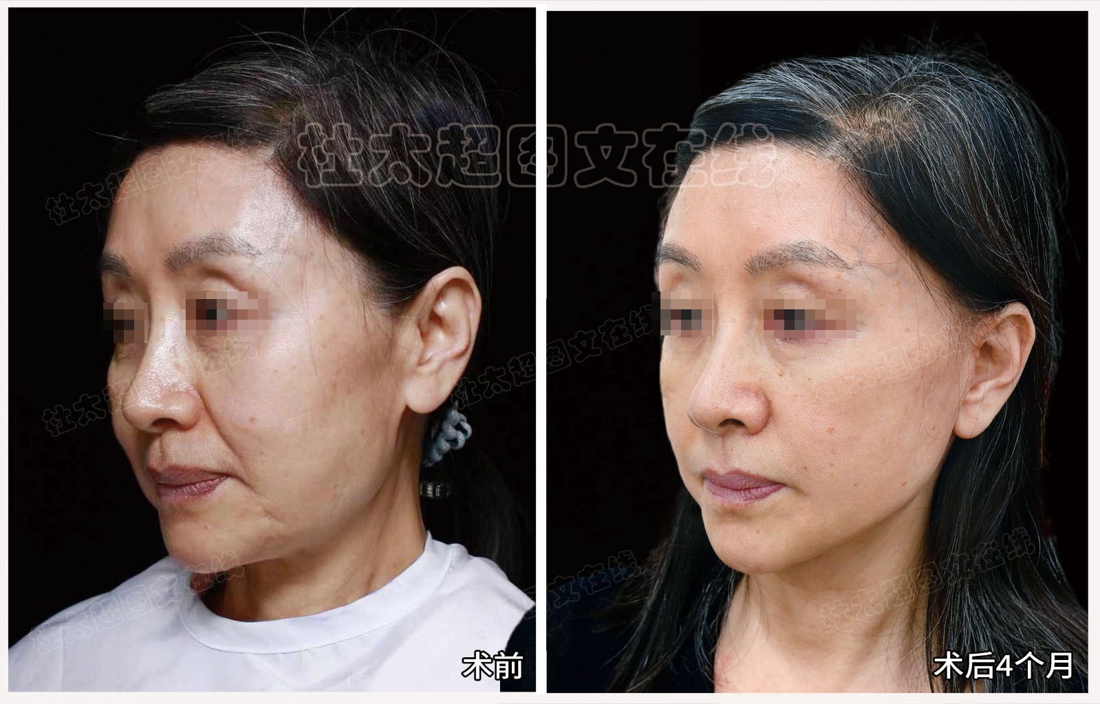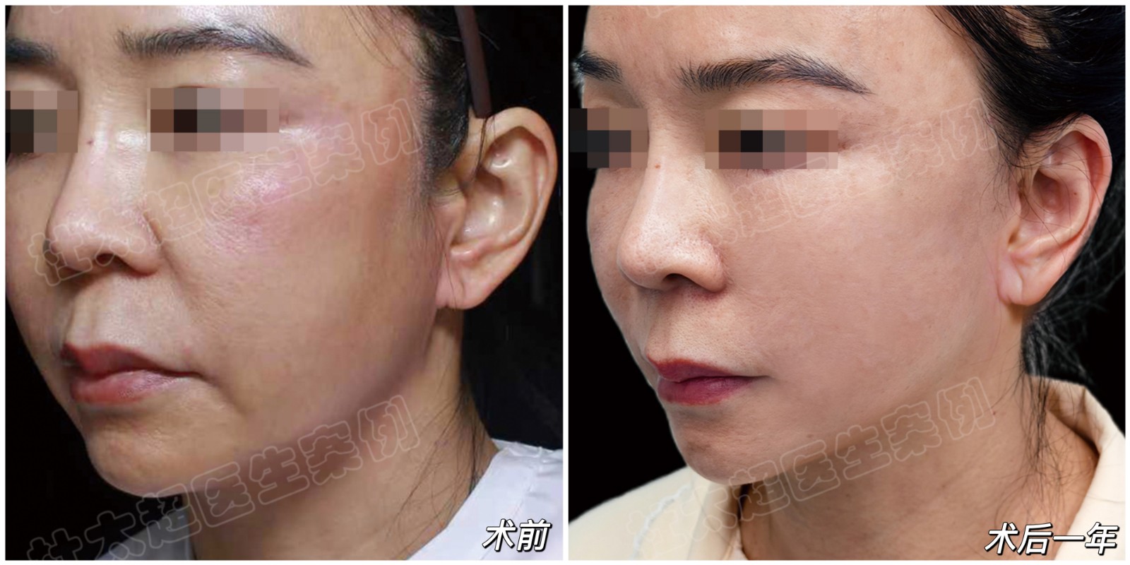 术前法令纹、口角纹明显,面部轮廓松弛下垂、双下巴有堆积感 ;经筋膜层复位拉皮手术,术后一年,组织整体提升,纹路淡化、轮廓紧致,效果自然且长效,展现拉皮面部年轻化实力 。