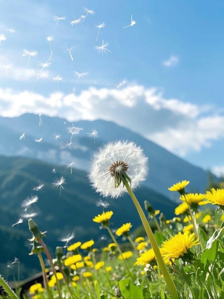 弱不禁风的蒲公英,如同灯笼一般展开的花果柔软得经不起轻轻的一吹,那飘满眼前的种子瞬间就若飞若停地飘向远方,寻找它生命的又一个着落。