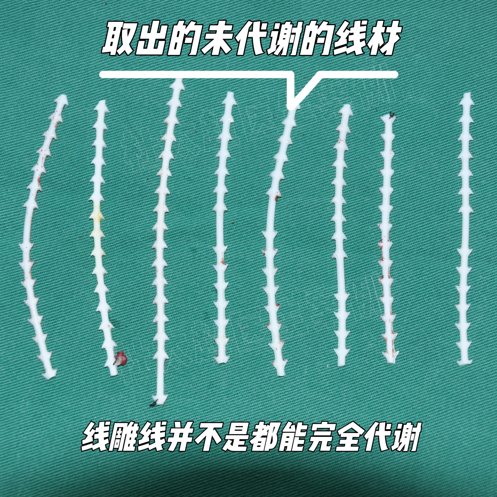 很多人觉得线雕线都能代谢,其实不是。线的材质不一样,像硅胶这种就不能,在皮下待久了可能发炎,比如泛红、肿、痒。所以我们做拉皮手术时,只要发现没代谢的线,都会取出来,不留麻烦。