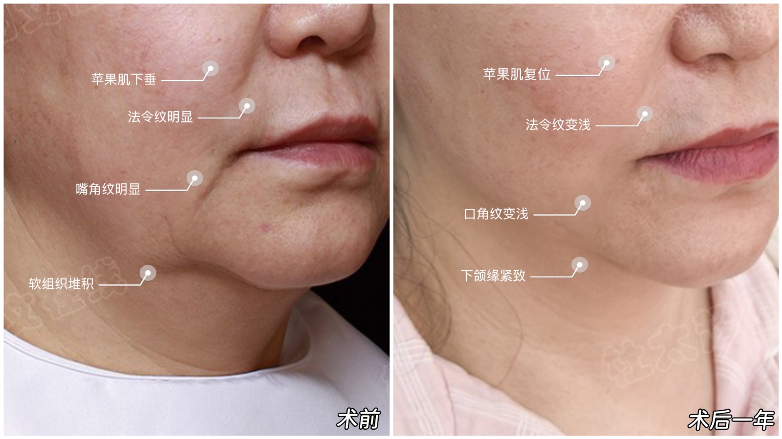 需针对性逐层解决,常用拉皮提升+脂肪处理+钻石精雕紧肤,全面干预各层次,复原口周年轻态。