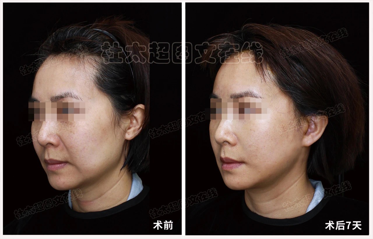 术前:面部松弛、苹果肌下移、法令纹及嘴角纹明显,伴羊腮问题。