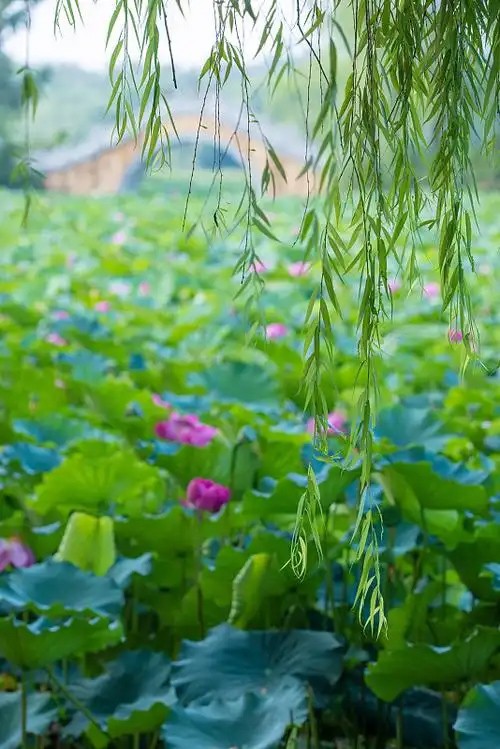 一阵风起,在荷塘岸边的杨柳随风起舞,宛如那一身绿纱的少女翩翩起舞,连同荷塘里的倒影一起,飘逸着流向远处。