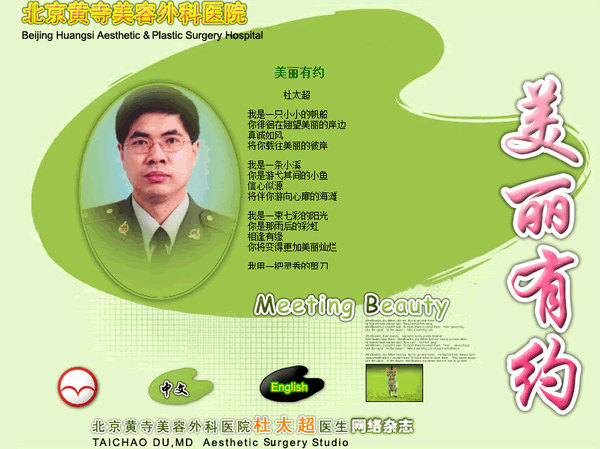 杜医师,您好,我是一个爱美青年,我能感受到您细腻的情感和较高的审美意识,激发了我对美的更加热爱,希望以后能从网页上学到更多的知识,加深对美的理解。