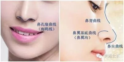 鼻部的美由4根曲线决定:鼻背曲线;鼻尖曲线;鼻翼基底曲线(鼻翼沟);鼻孔缘曲线(海鸥线)