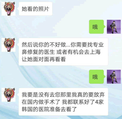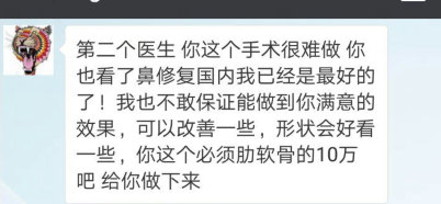 努尔倾诉:“找的第一个医生面诊时,称手术修复用膨体和耳软骨以及鼻中隔还不够,需要用到肋骨,手术费用最低也需要8万元。另一个上海的医生,自称是给央视主持人做过手术,看了我的照片,说很难做,需要去找专业的鼻修复专家才行,另外还有一个朋友介绍的专家,微信看了我发过去的图片,称只用硅胶和耳软骨,而专家又在国外,等他回国后先面见一下”。