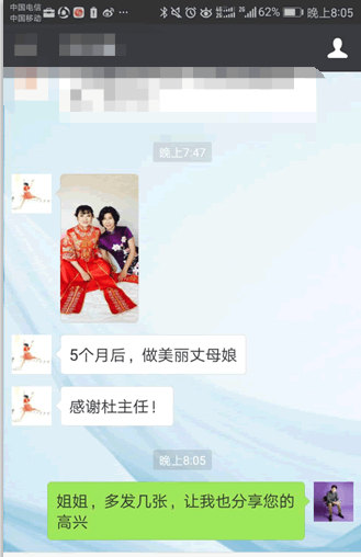 "5个月后,做了美丽的丈母娘,感谢杜主任!" 昨日,五四青年节,远在大洋彼岸的妮子给杜太超主任发来微信,分享在女儿婚礼现场,与女儿合影的美丽靓照。母女依偎,穿着的中式服装,优雅的面庞,洋溢着满满的幸福,光彩照人。